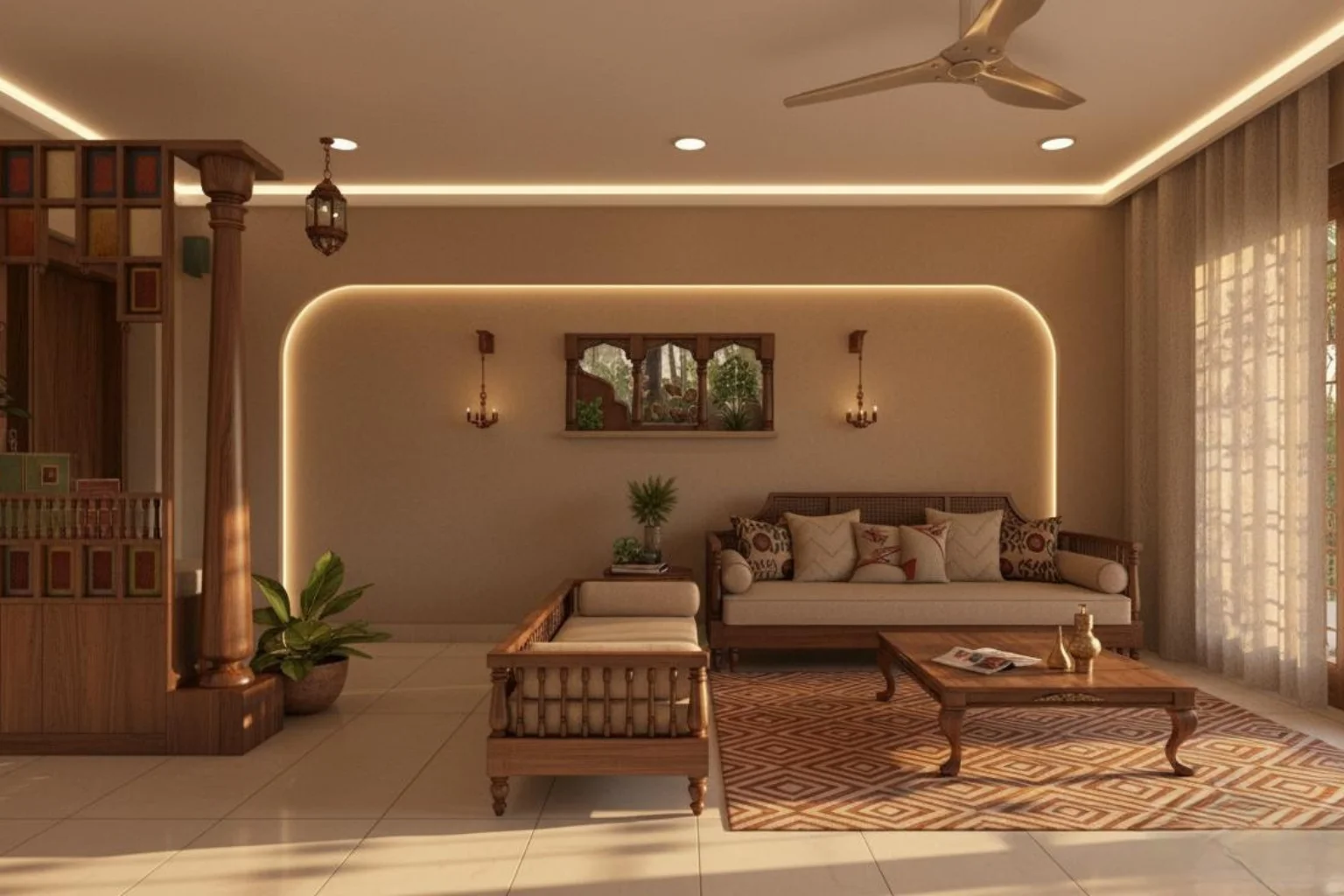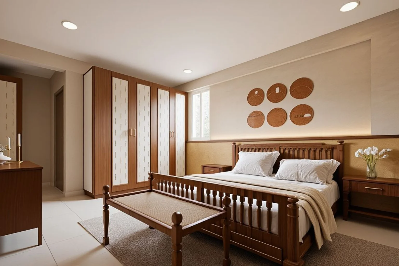 • Harmonious Palette: The color story is anchored in muted ochres, terracotta’s, and creamy whites, providing a serene backdrop that allows the intricate wood details and decorative “Mandana” or “Rangoli” wall art to stand out.
