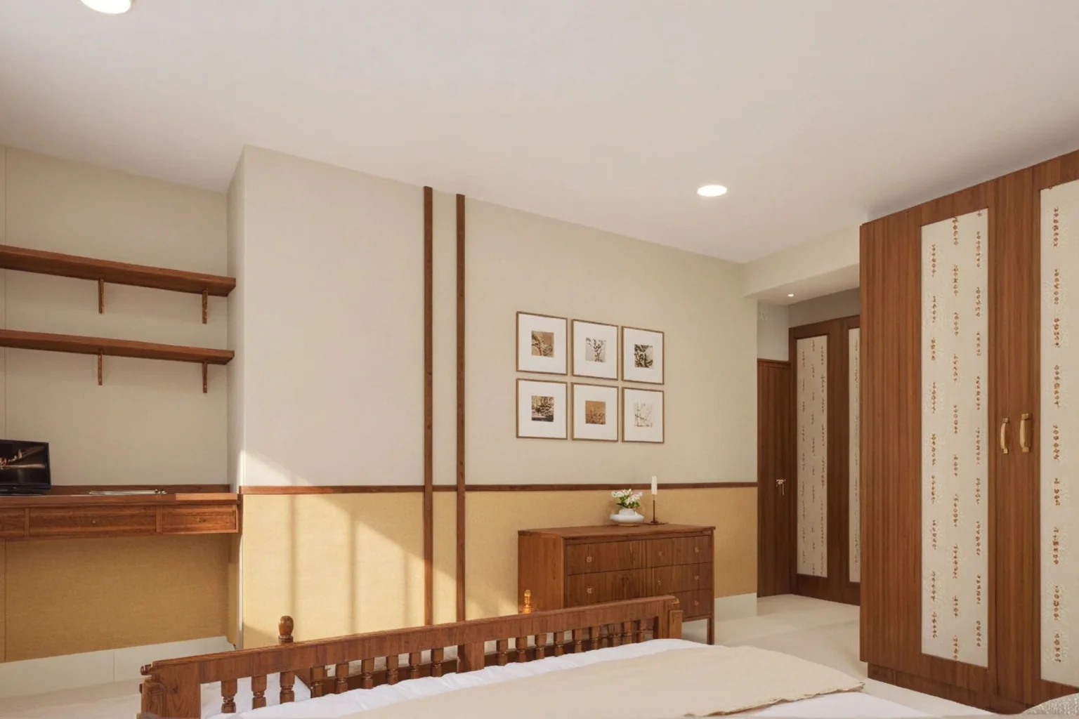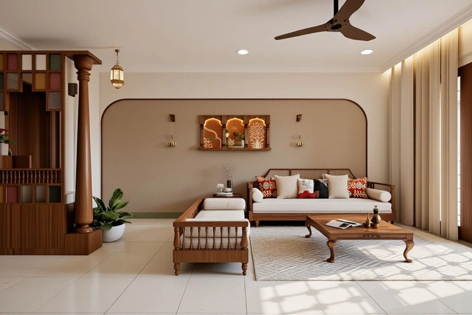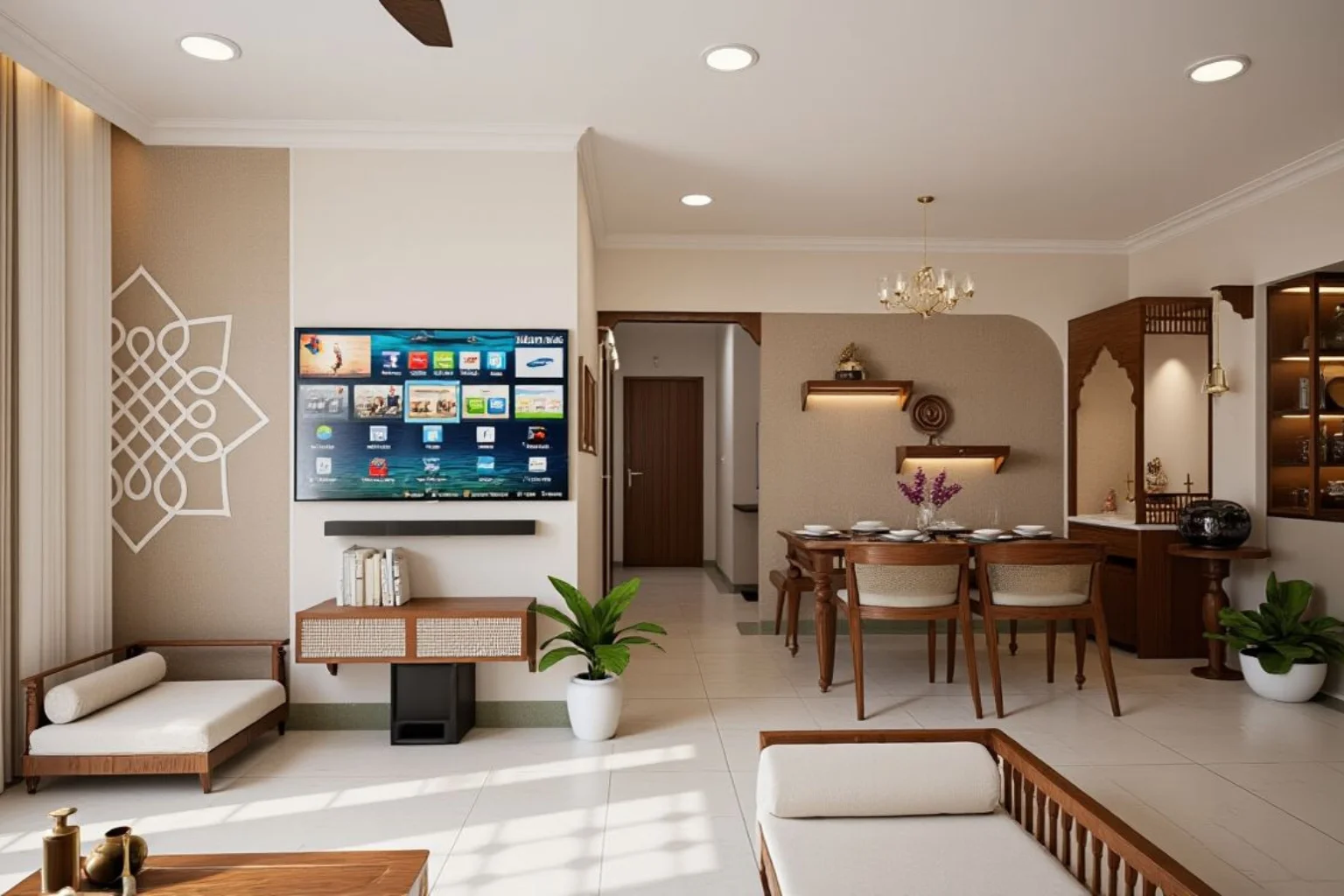 This project presents a sophisticated fusion of traditional Indian heritage and contemporary minimalist design. By marrying ornate, handcrafted elements with clean lines and a neutral palette, the space achieves a “Modern Vernacular” aesthetic—a home that feels deeply rooted in culture yet functions for a modern lifestyle.
